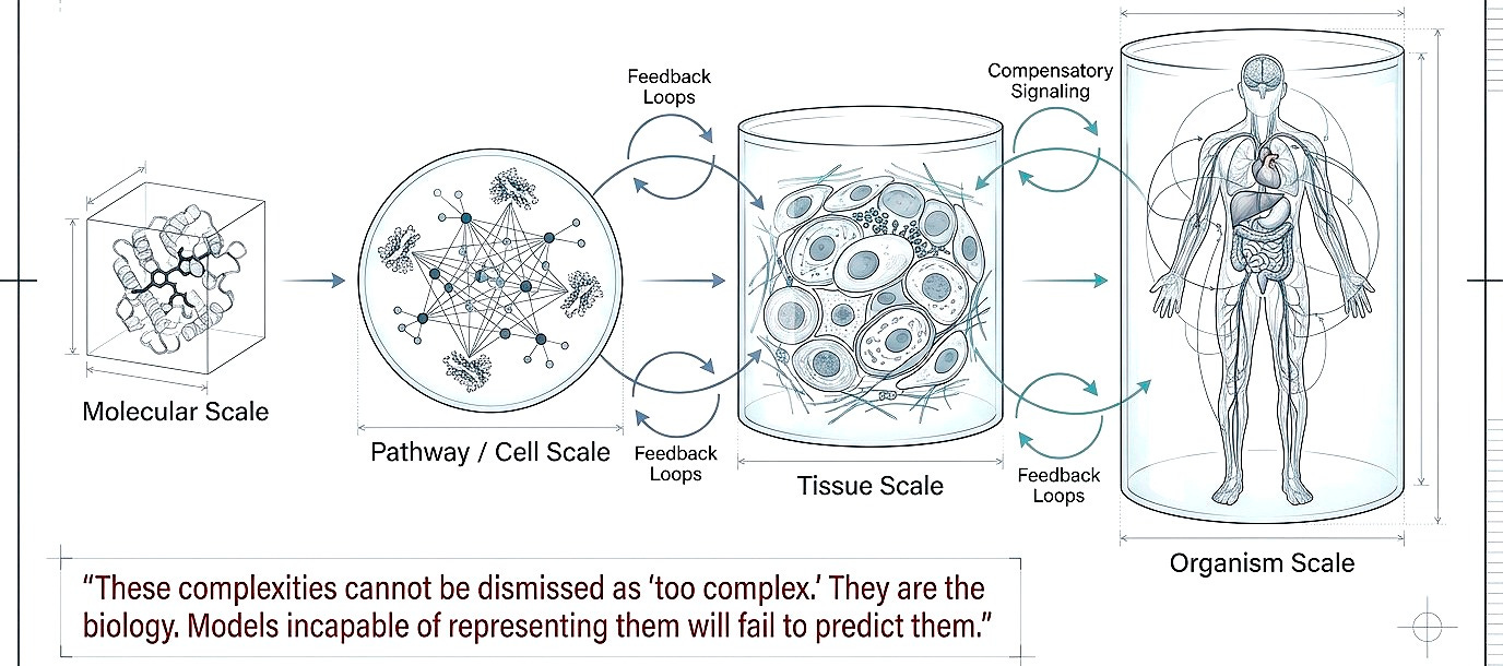 Multiscale modeling (molecule to pathway, pathway to tissue, tissue to organism. Feedback loops, compensatory signaling, immune modulation) cannot be dismissed as “too complex.” They are the biology. Models incapable of representing them will fail to predict them.