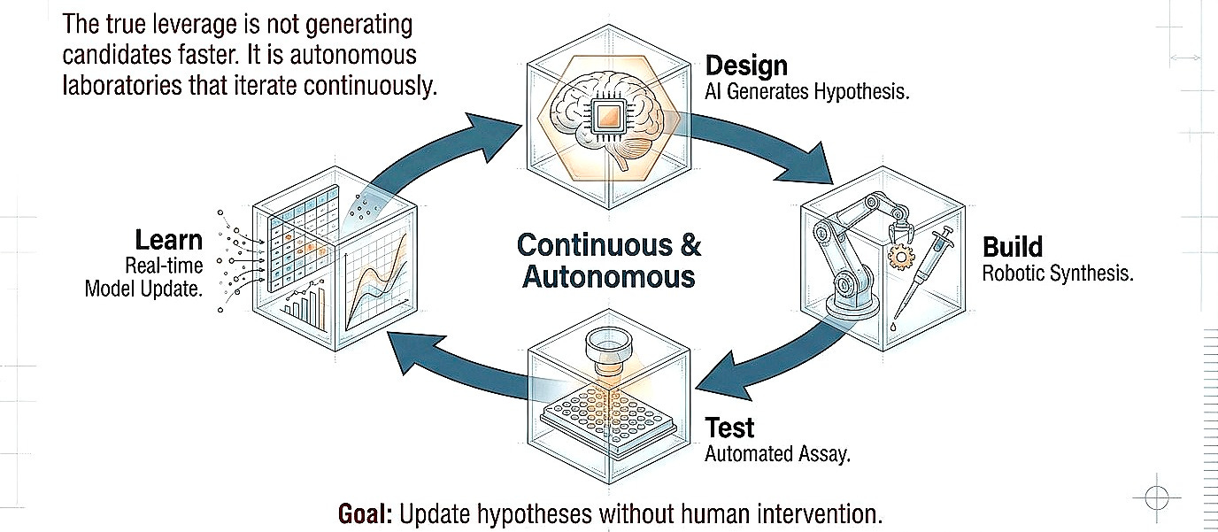 I think the true leverage is not necessarily generating candidates faster but closing the design-build-test loop at higher fidelity. Autonomous laboratories that iterate continuously, learning from failure in real-time, updating hypotheses without human bottleneck. Even with humans in the loop, the focus should shift more toward uncovering biologic effects, preferably in humans, rather than optimization in the chemical space.