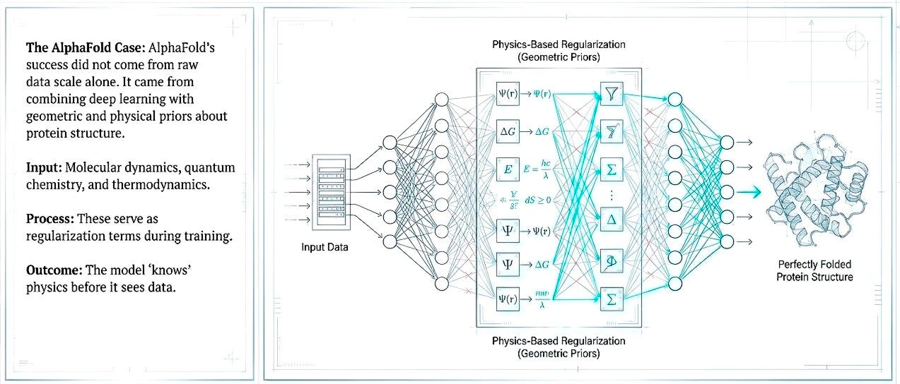 The next generation of AI discovery efforts must embed physical constraints, molecular dynamics, quantum chemistry, and thermodynamics, not as post-hoc validation but as regularization within the learning process. AlphaFold’s success came from combining deep learning with geometric and physical priors about protein structure. Pattern recognition constrained by physical law reduces the space of plausible solutions and decreases dependence on massive but biologically shallow datasets.